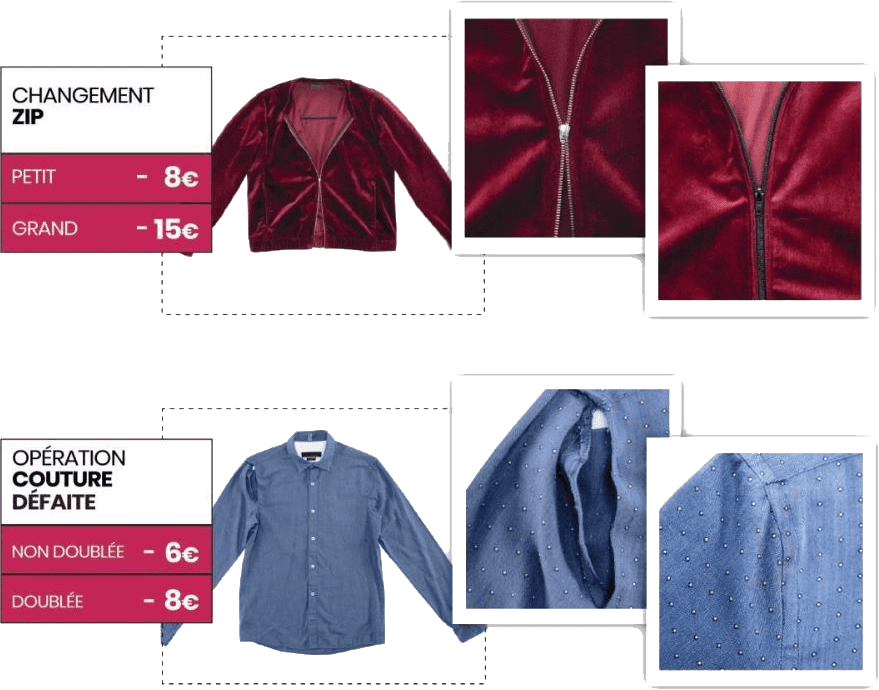 Grâce au Bonus Réparation, vous bénéficiez de remises immédiates de 6 à 25 € sur la réparation de vos vêtements : zips cassés, trous, coutures défaites…